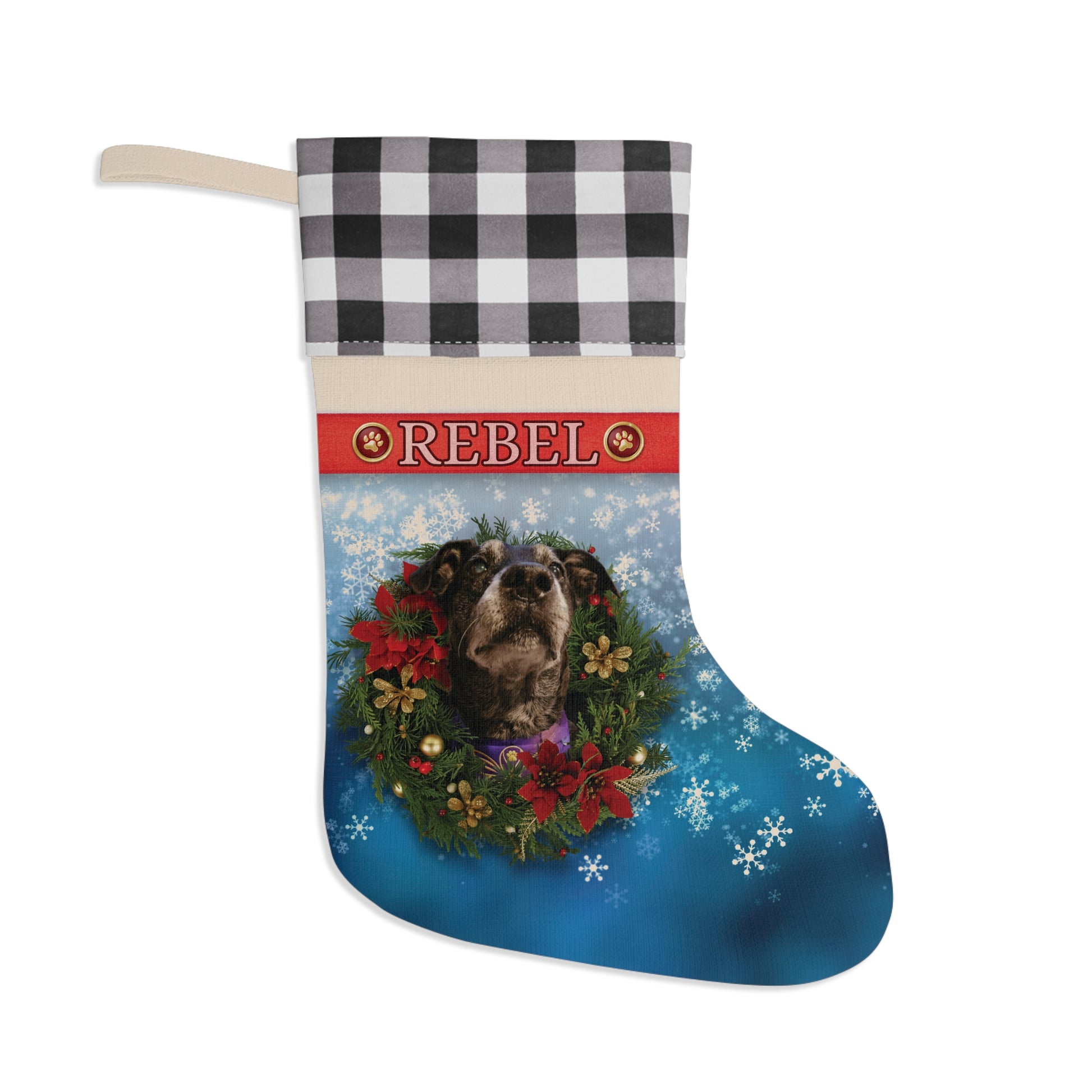 Personalized Dog Christmas Stocking — Buffalo Plaid Top with Pet Name